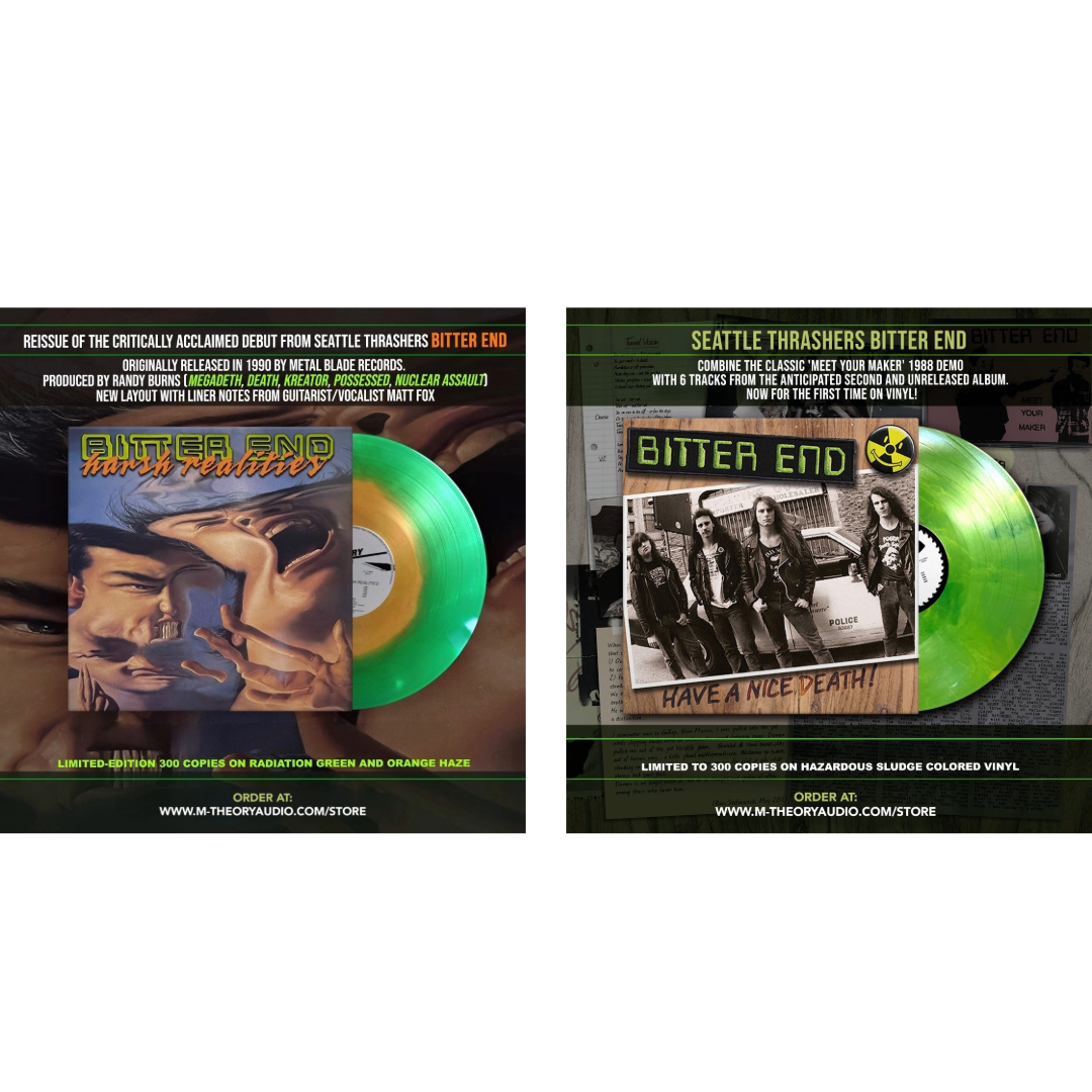The Seattle thrash band released their debut album “Harsh Realities" on Metal Blade Records in 1990, after the success of their “Meet Your Maker” demo tape hailed by fanzines, underground/college radio, and tape traders. The album received strong reviews at the time from Metal Forces and Kerrang!, and the music video for the title track received airplay on MTV's “Headbanger's Ball.” The band cultivated their live presence with prolific shows in their hometown scene alongside future giants such as Soundgarden and Alice In Chains and toured alongside fellow thrash greats such as Sacred Reich and DRI. The group began tracking their follow-up record at Robert Lang Studios in Seattle with famed producer Jack Endino (Nirvana, Soundgarden, Mudhoney) handling mixing duties, however the shifting tides of the music industry and creative differences resulted in the dissolution of BITTER END in 1992 before their next album could be completed.